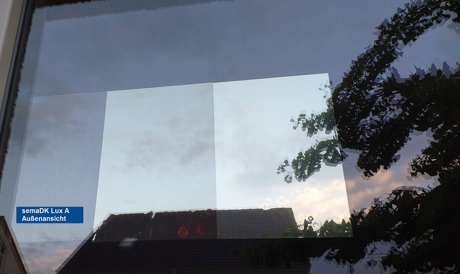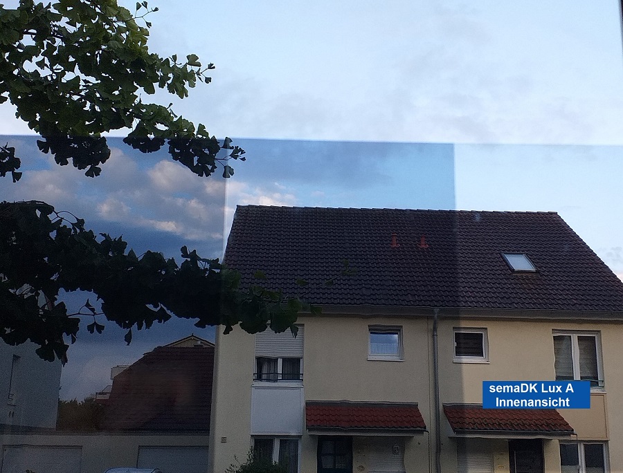 Ein integrierter Blendschutz verbessert raumseitg das Arbeiten an fensternahen Monitoren und unterstützt die ungehinderte Sicht nach draußen. Die Sonnenschutzfolie erscheint in der Durchsicht hellbau, silberfarben. Die Folie semaDK® Lux A verfügt über eine rückseitige Klebstoffschicht auf Acrylatbasis. Mit der Sonnenschutzfolie semaDK Lux A werden hohe Lichteinträge am Fenster über den gesamten spektralen Bereich bis ca. 40% gegenüber einem normalen Fensterglas reduziert. Die Folien werden nassverklebt auf die Außenseite des Fensters angebracht.